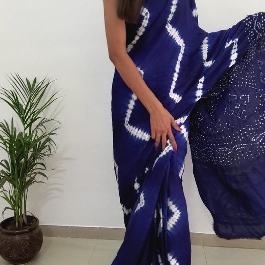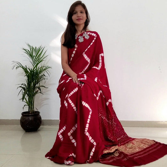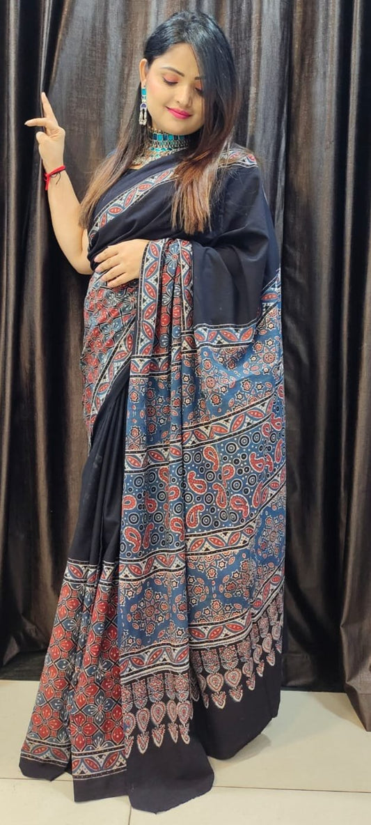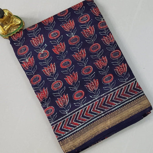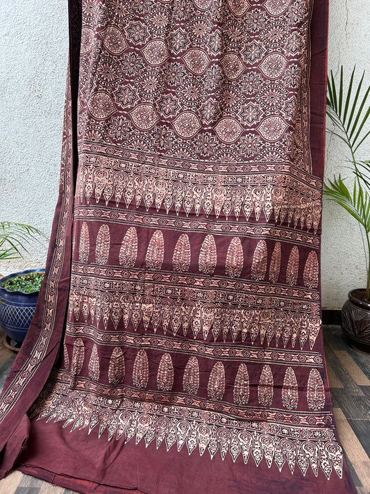 Ajrakh Hand BlockPrint Maheshwari Silk Cotton Saree with Gold zari Border