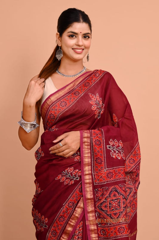 33. Ajrakh Hand BlockPrint Maheshwari Silk Cotton Saree with Gold zari Border