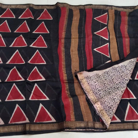32. Hand BlockPrint Maheshwari Silk Saree with Gold zari Border