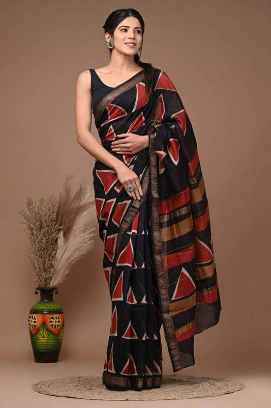 36. Hand Block Print Maheshwari Silk Cotton Saree with Gold zari Border
