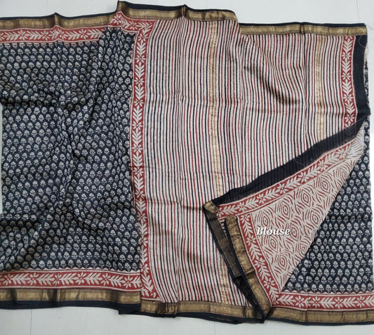 31. Hand BlockPrint Maheshwari Silk Saree with Gold zari Border