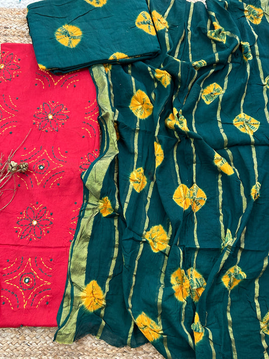 Bandhej HandWork Cotton Dress Material with Mirror work