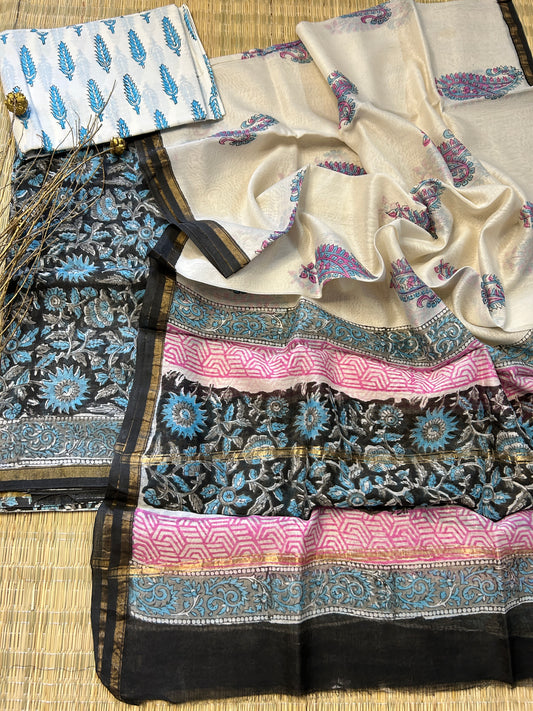 Chanderi Pure Silk Hand Blockprint Dress Material with Silk Bottom