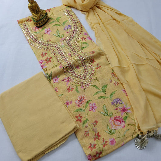 Linen Cotton HandWork Dress Material with Chiffon Dupatta