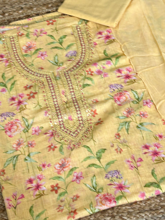 Linen Cotton Floral Print Dress Material with Handwork