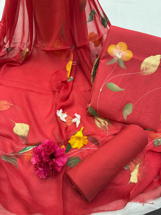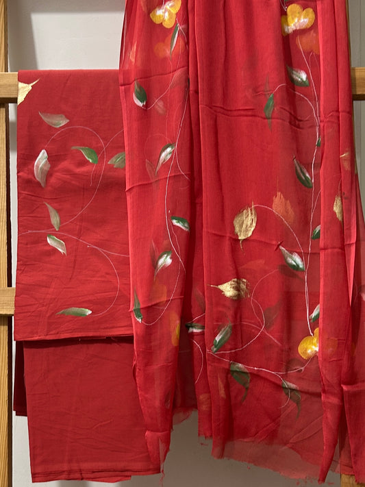 Hand Painted Cotton Dress material with Chiffon Dupatta