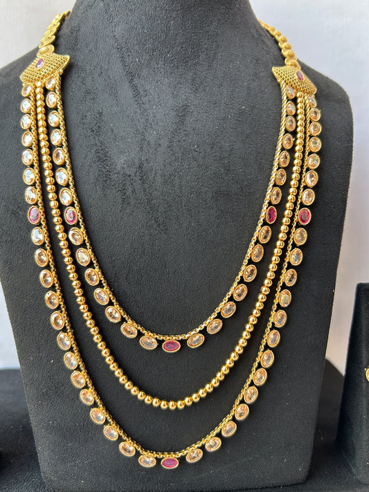 Long 3 layers Necklace with Earrings in Gold Finish - Code- GOLD09