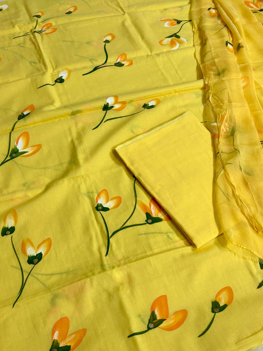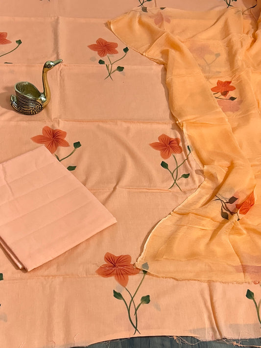 Hand Painted Cotton Dress Material with Chiffon Dupatta