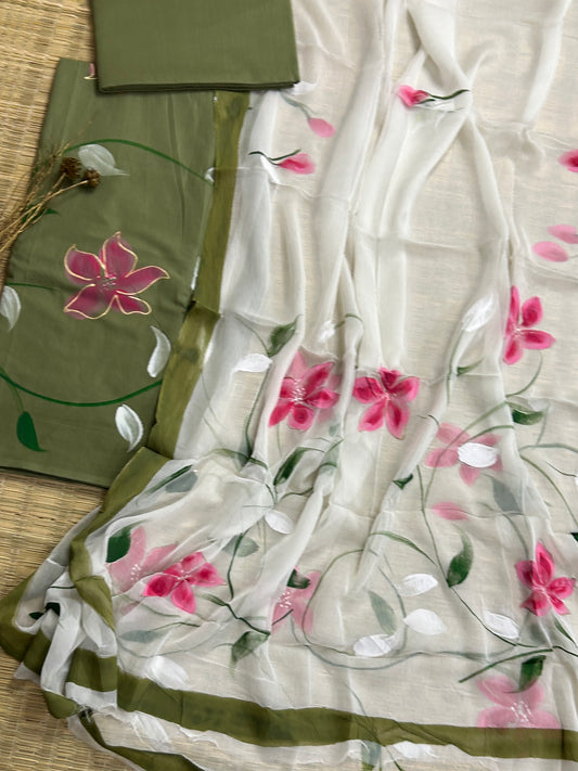 Hand Painted Cotton Dress Material with Chiffon Dupatta