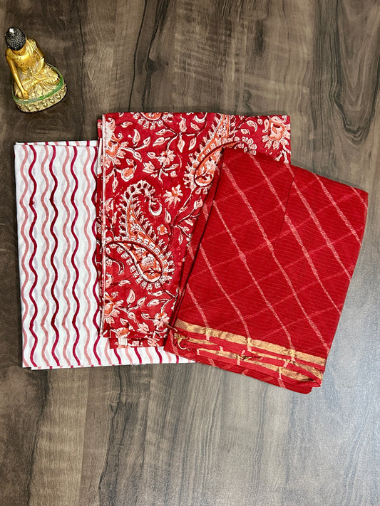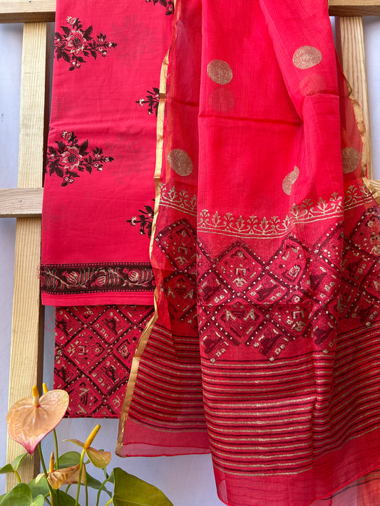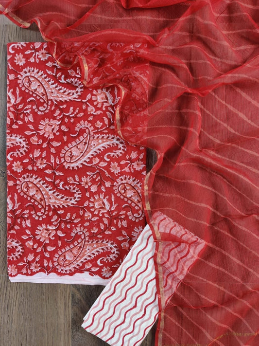 Hand BlockPrint Cotton Dress Material with Lehariya Kota Dupatta