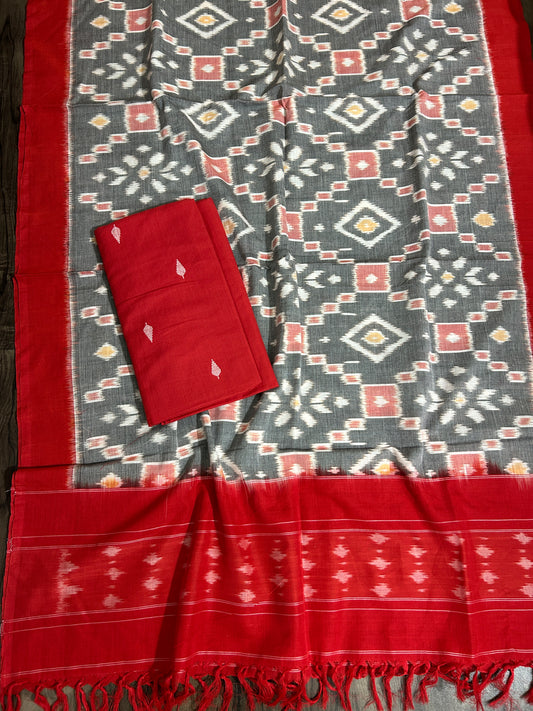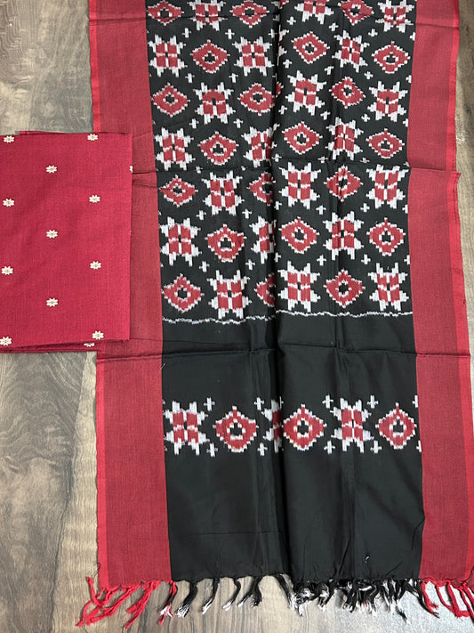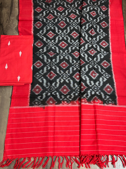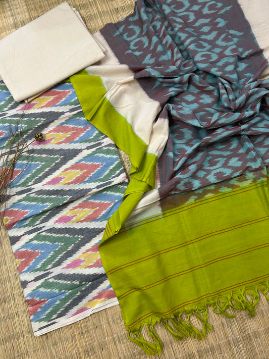 Flaunt Timeless Indian Handloooms - Pochampally Ikat dress materials, resist yarn-dyed patterns woven into soft cotton and silk Dress Material. These unstitched 3-piece salwar sets are your comfort clothing in any season. Customize them into any fashionable design and wear them on any casual or formal occassion.