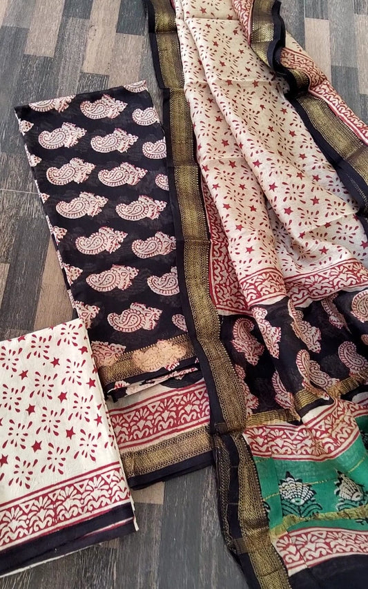 Hand Bloc Print Chanderi Silk Cotton Dress Material