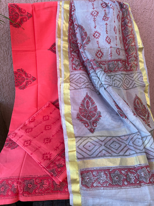 Hand BlockPrint Cotton Dress Material with Kota Silk Dupatta