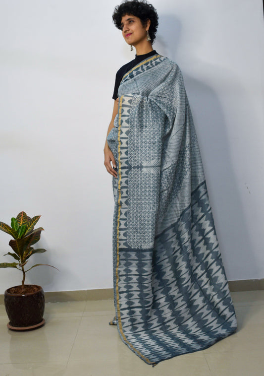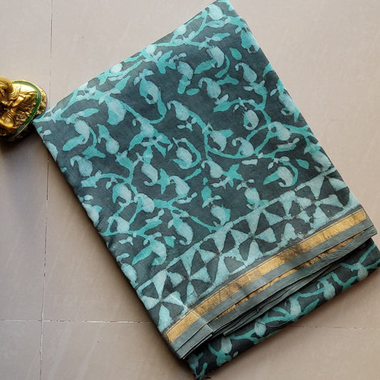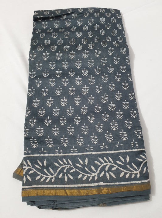 Grey Chanderi Silk Cotton Hand block printed Saree