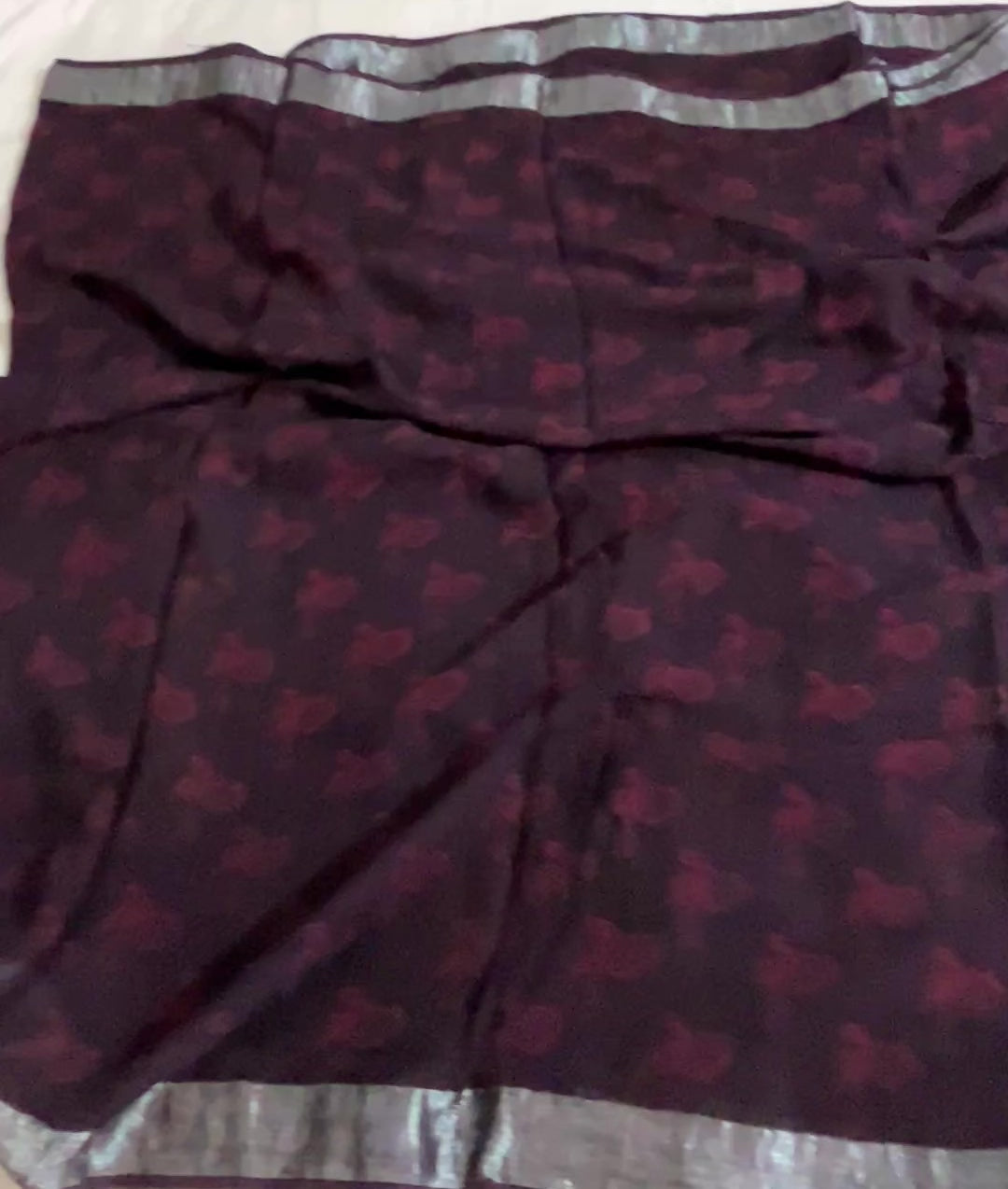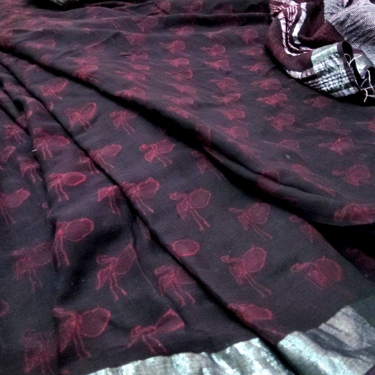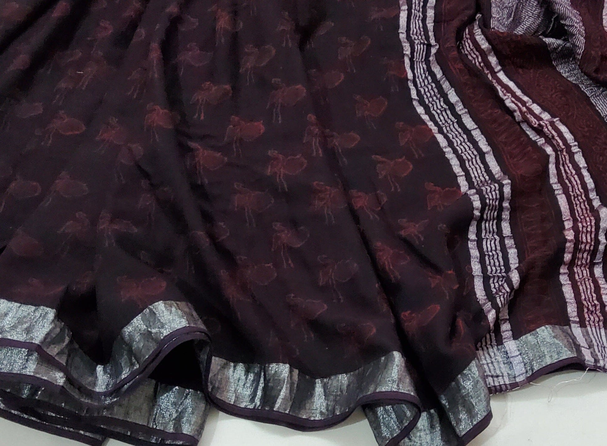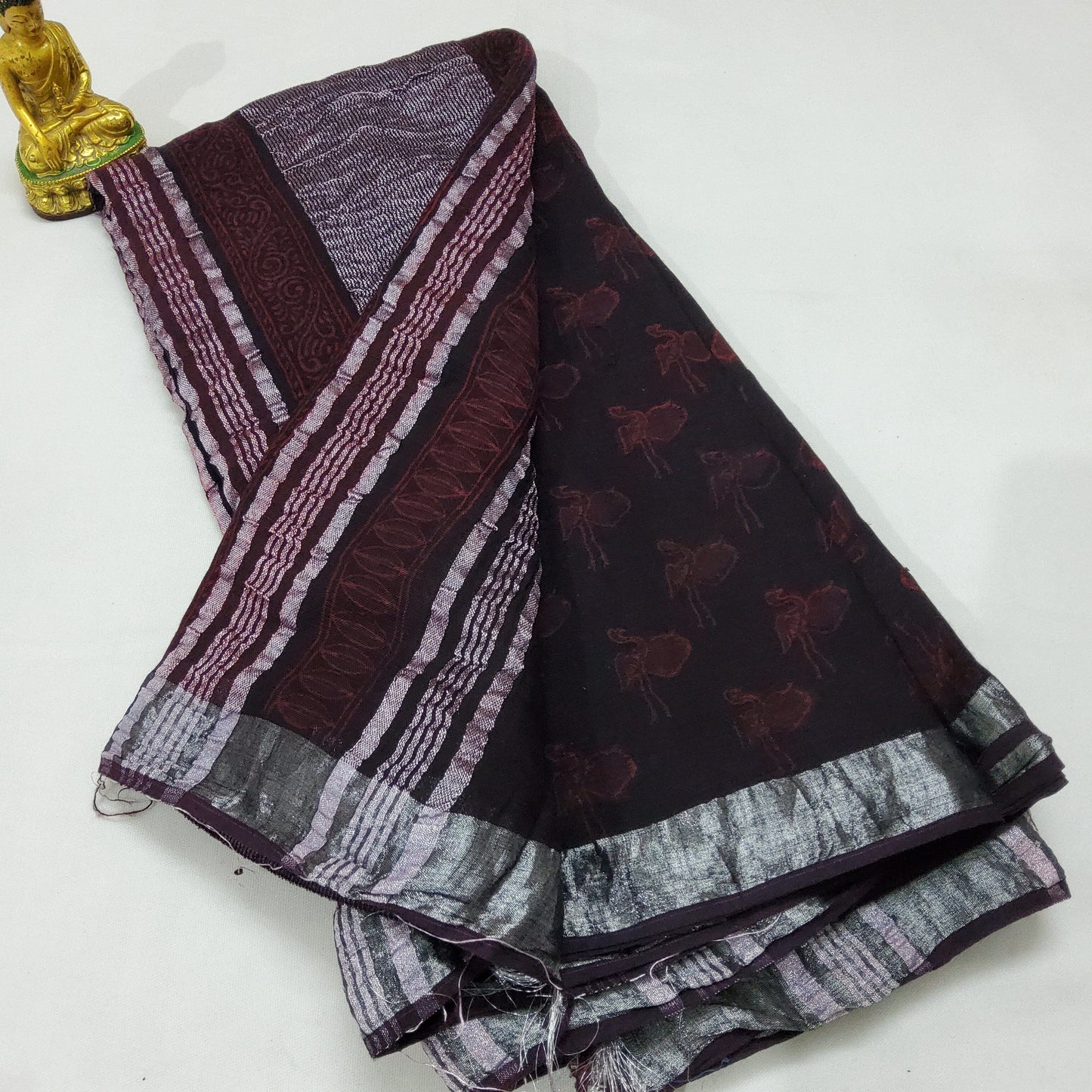 Akola Hand Block Print Linen Cotton Saree with Silver Border