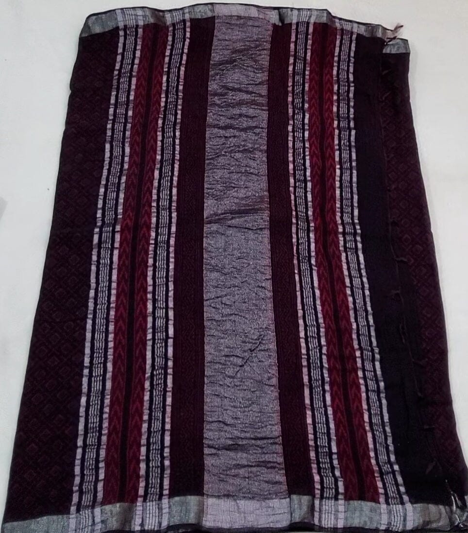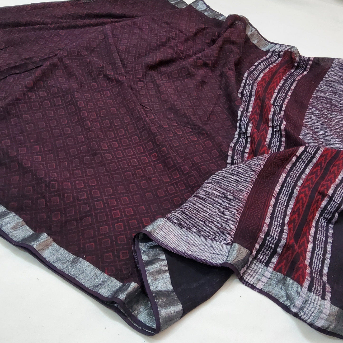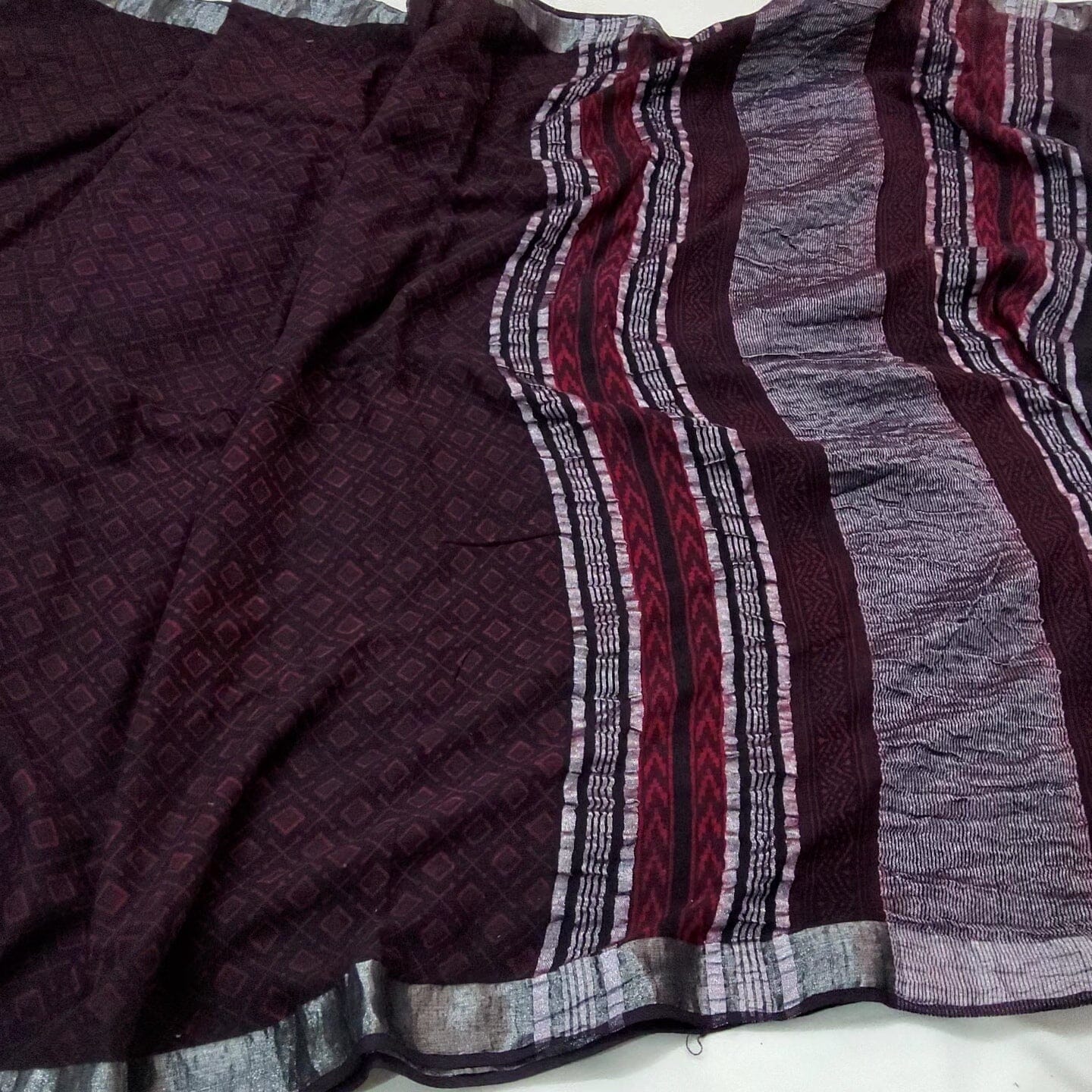 Akola Hand Block Print Linen Cotton Saree with Silver Border