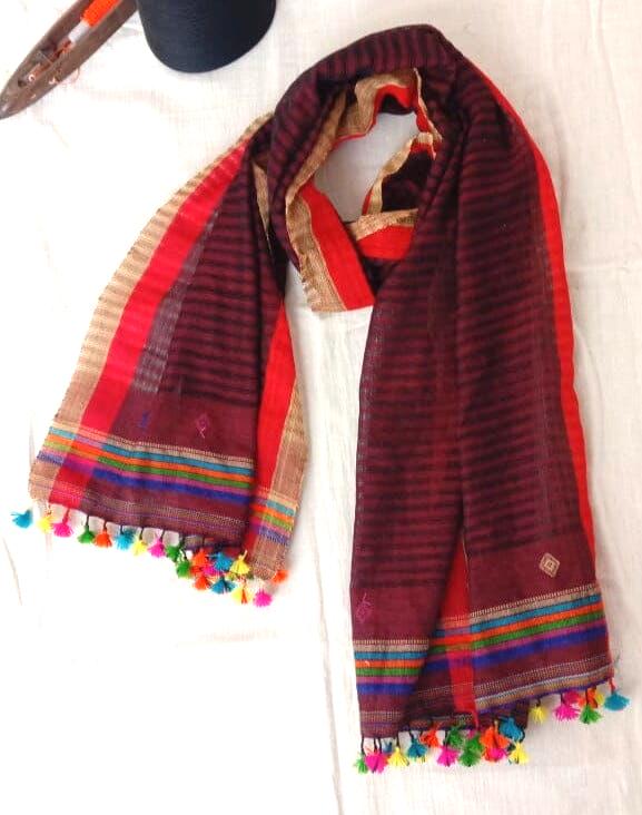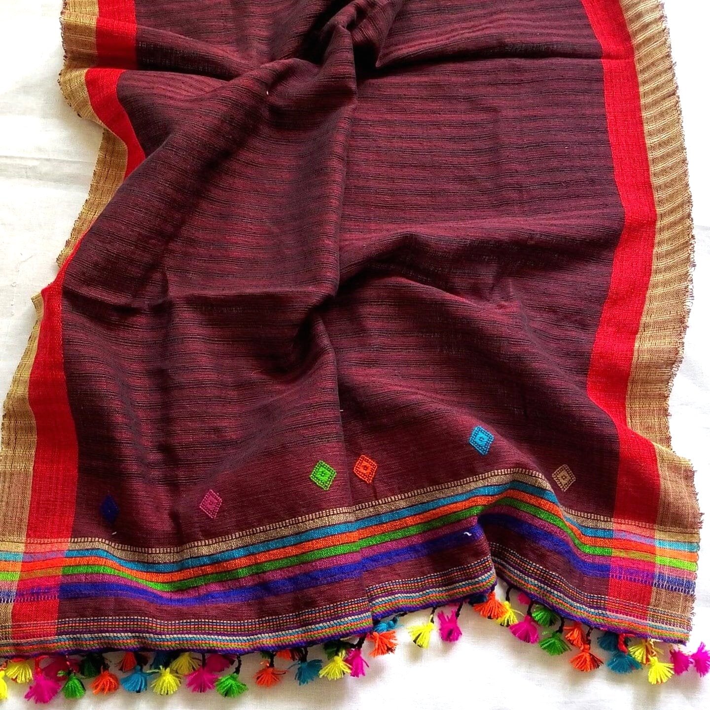 Maroon Bhujodi Embroidered Cotton Stole with handmade tassels