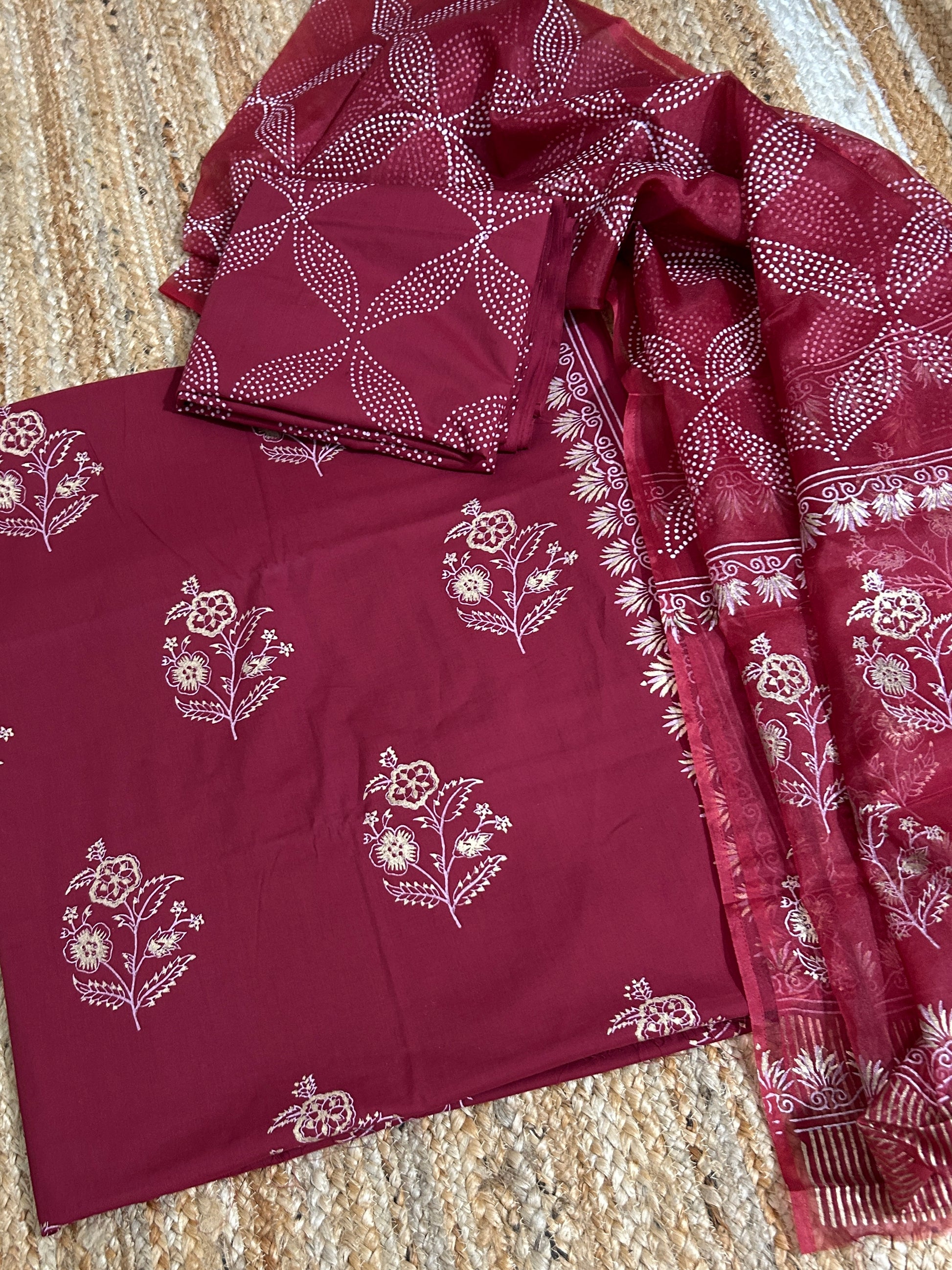 Hand BlockPrint Cotton Dress Material with Organza Dupatta