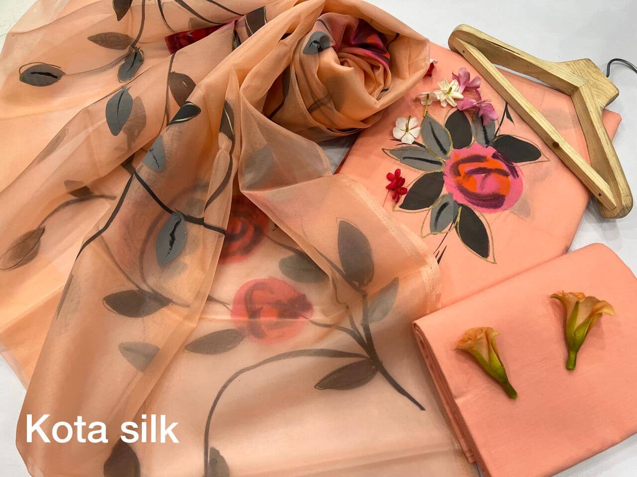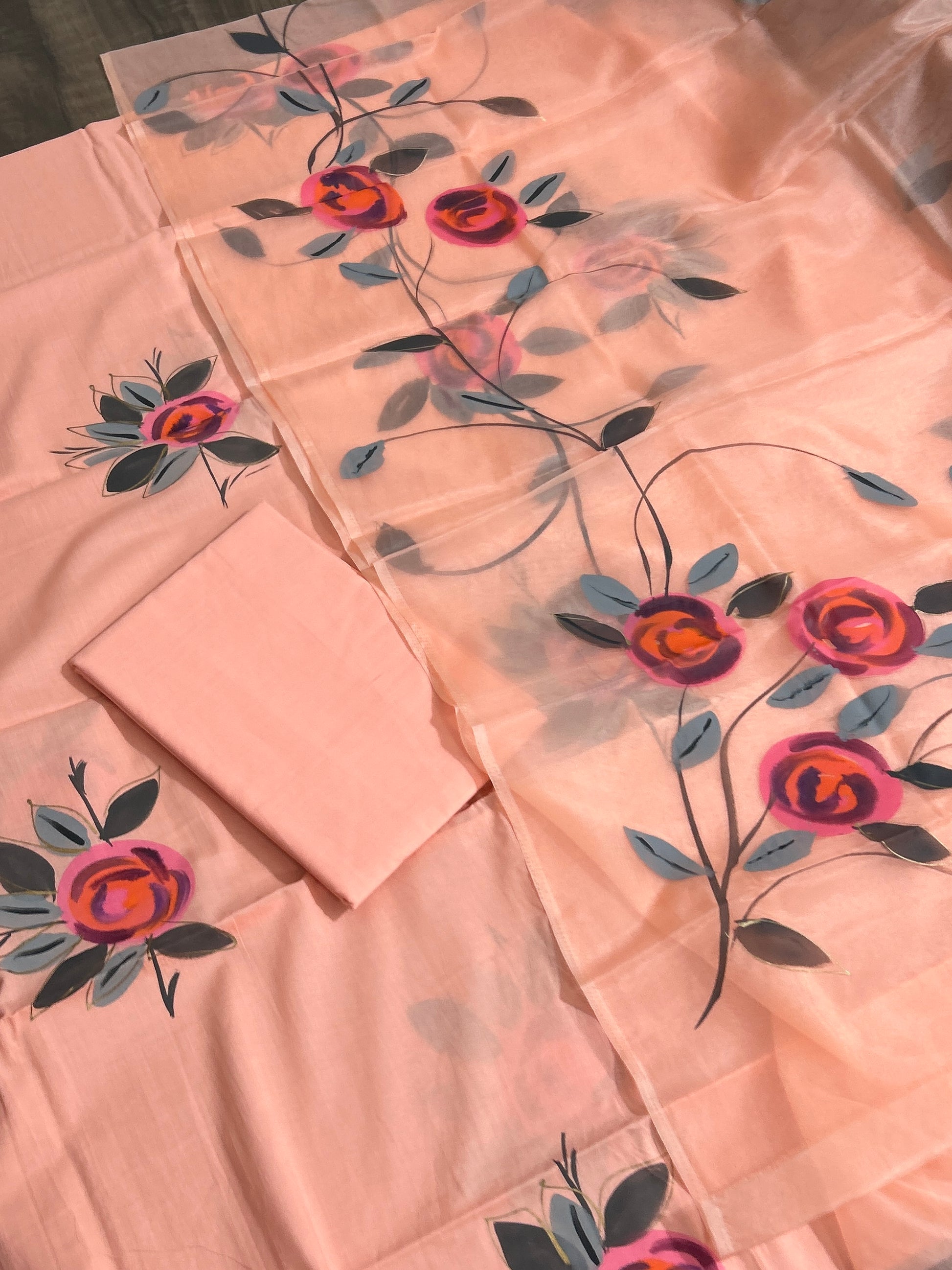 Hand Painted Cotton Dress Material with Organza Dupatta