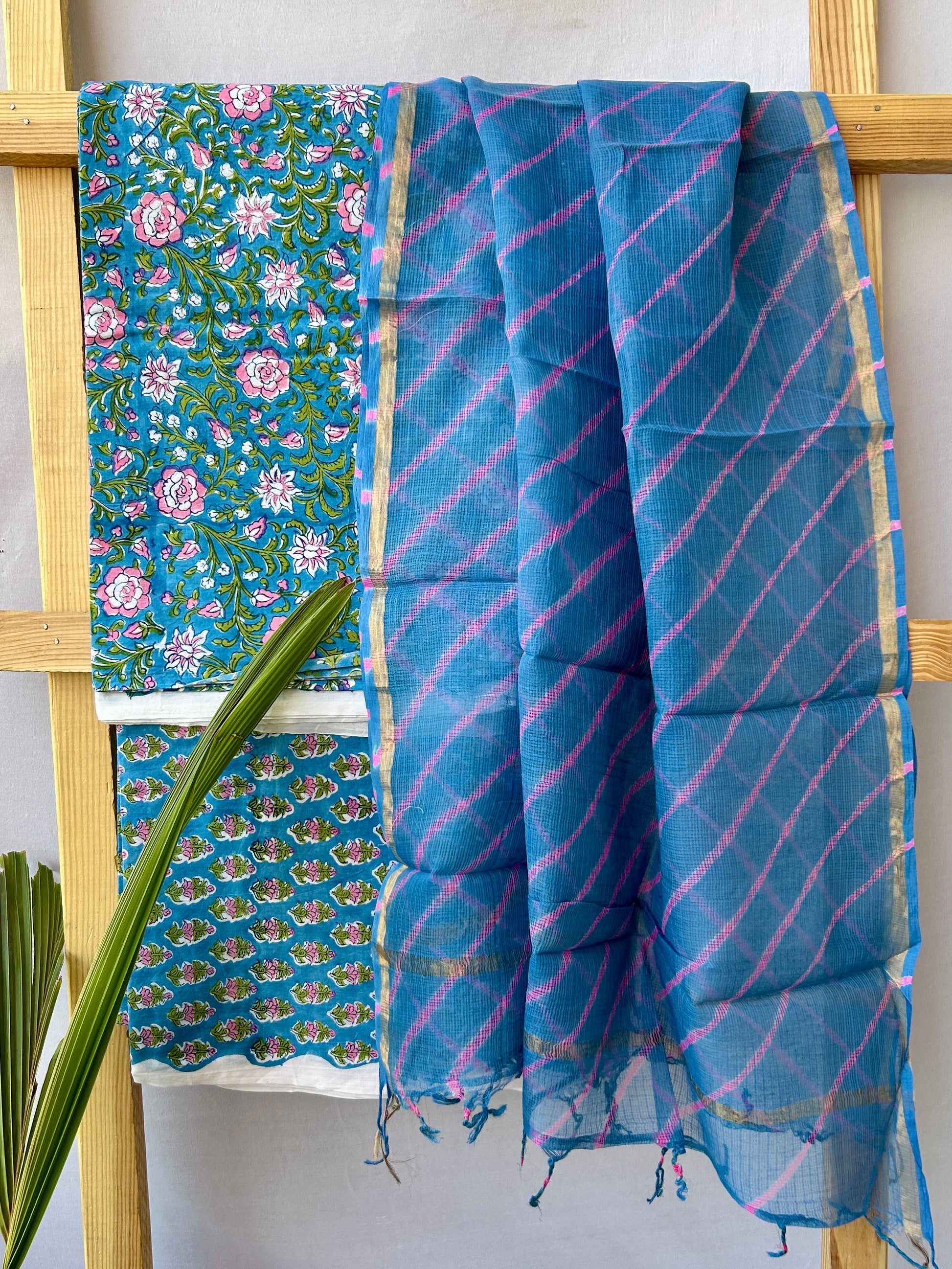 Hand BlockPrint Cotton Dress Material with Lehariya Kota Dupatta