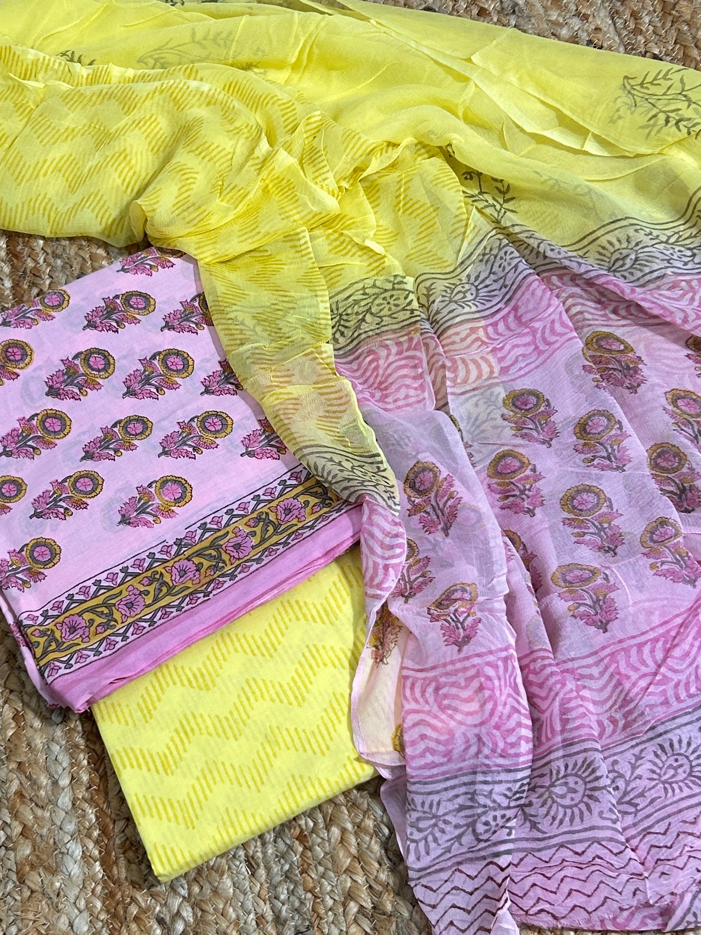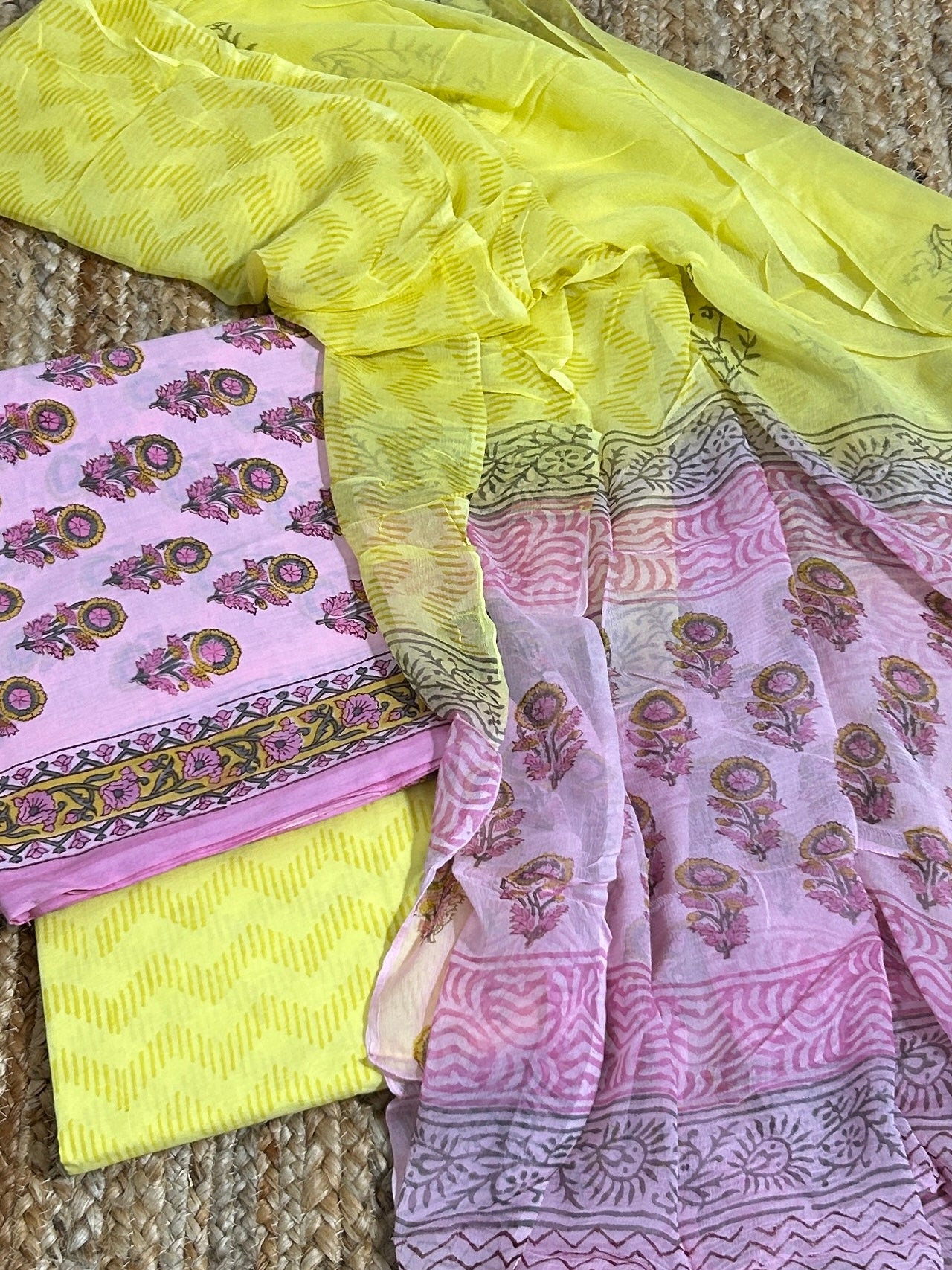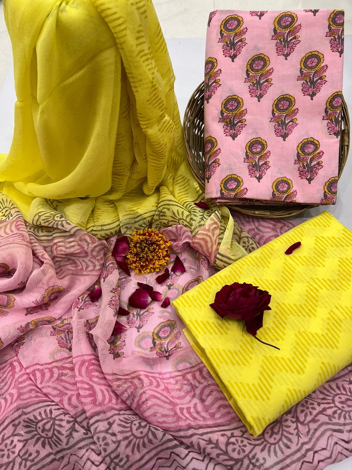Cotton Hand Block Print Dress Material with Chiffon Dupatta