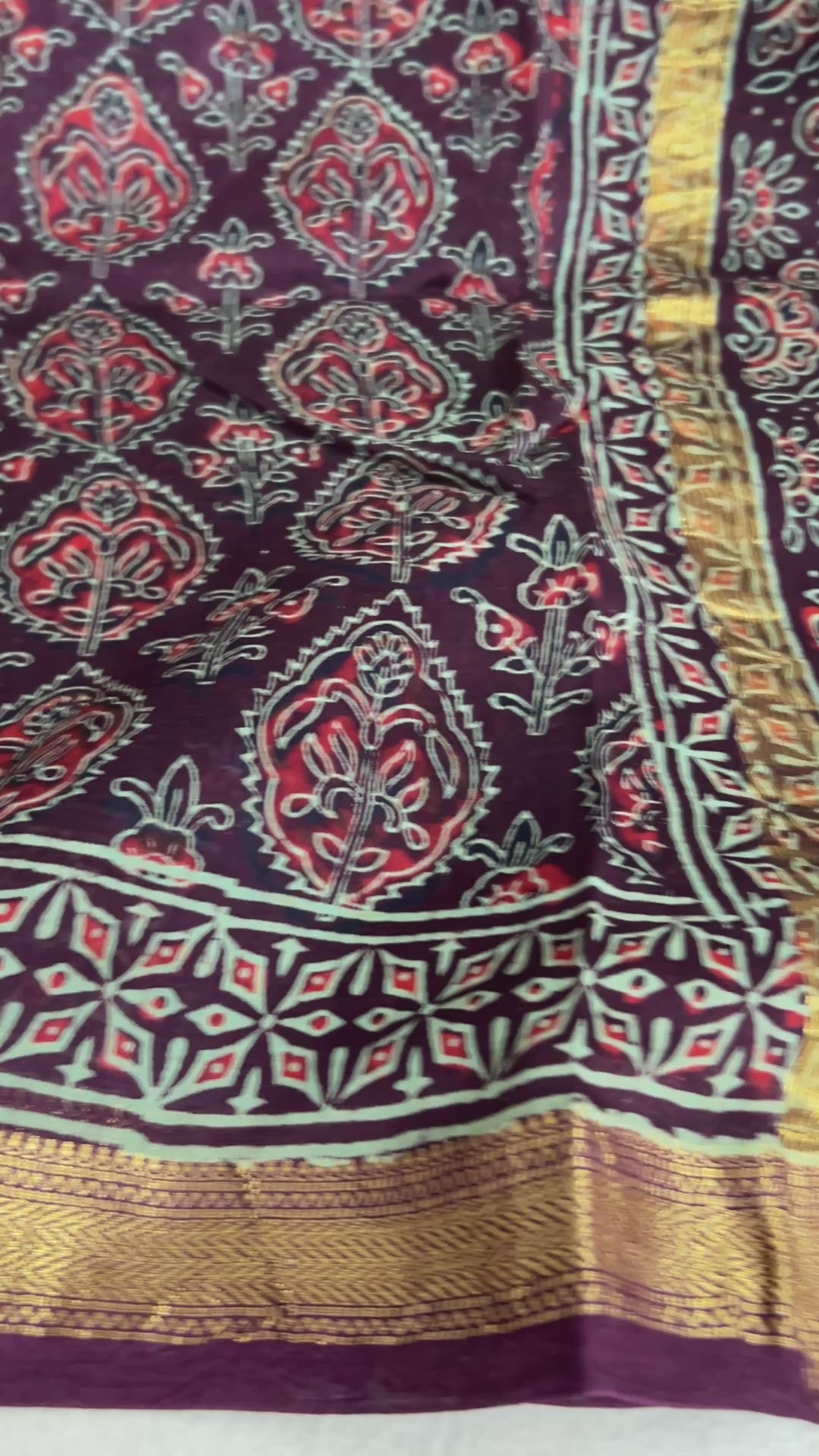 Ajrakh Maheshwari Silk Cotton Saree with Gold zari Border