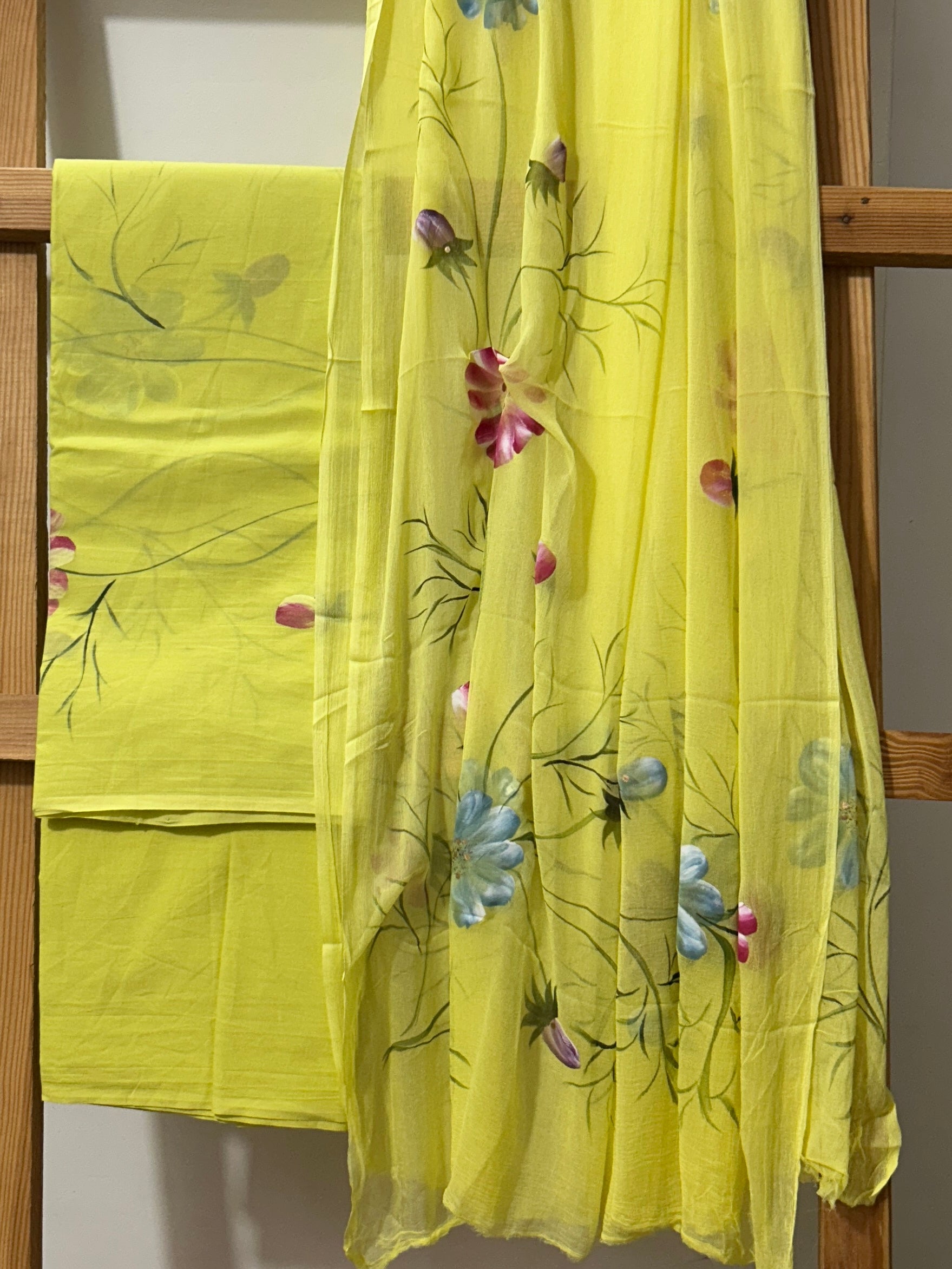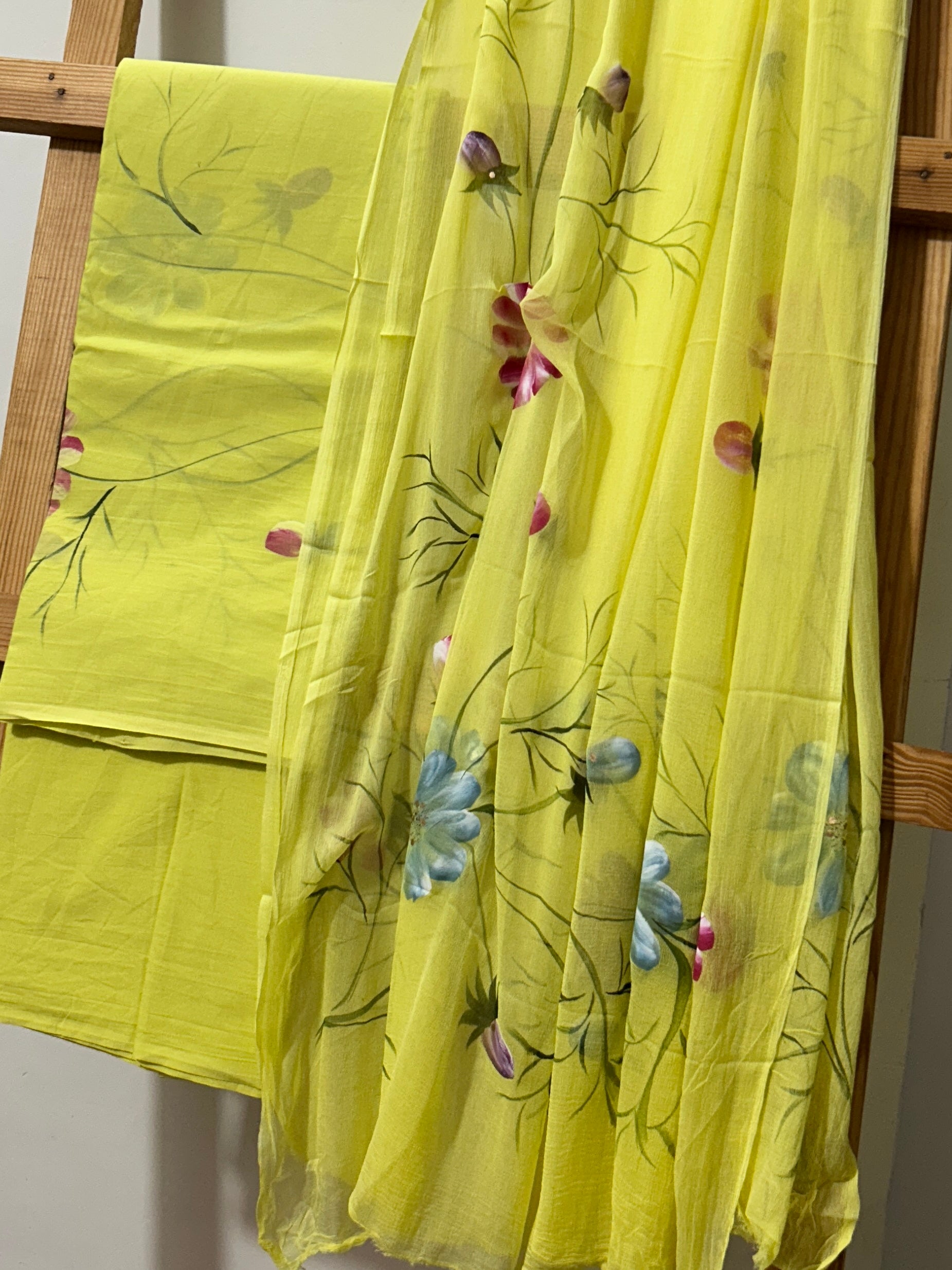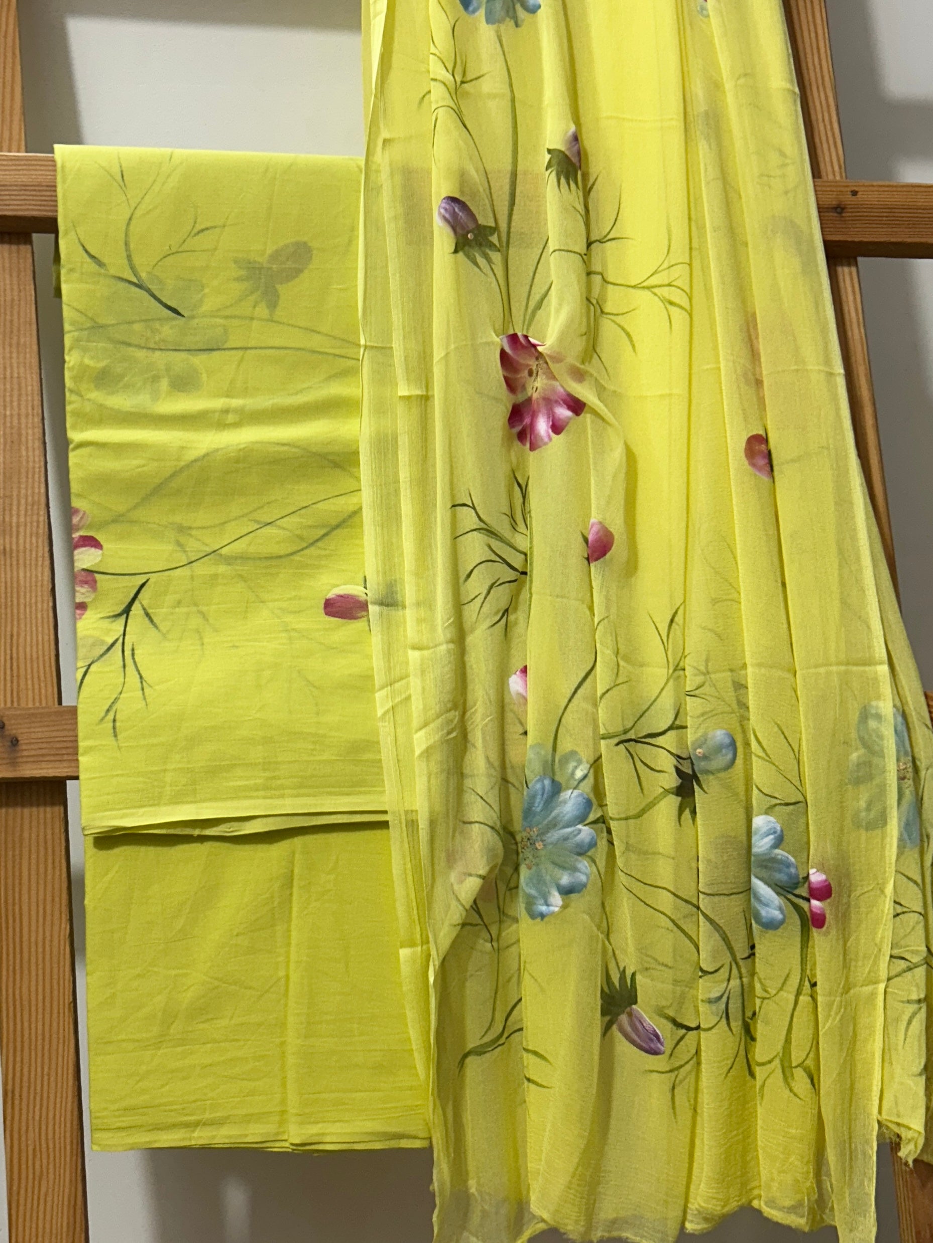 Hand Painted Cotton Dress material with Chiffon Dupatta