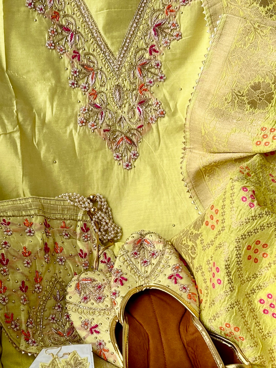 Banarasi Dress Material with Matching Potli, Jootis, Danglers