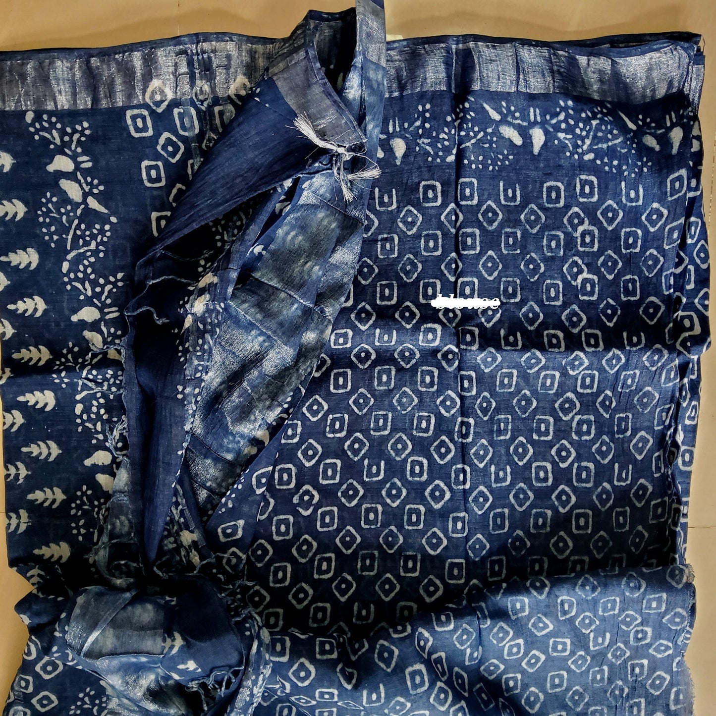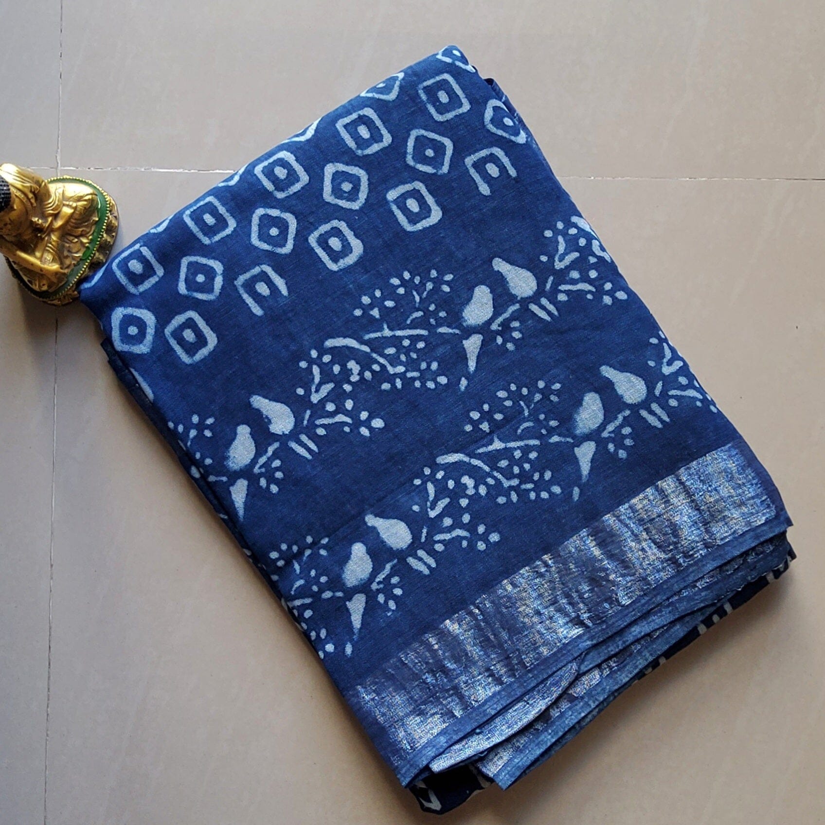 Linen Cotton Hand Block Print Saree with Silver Border