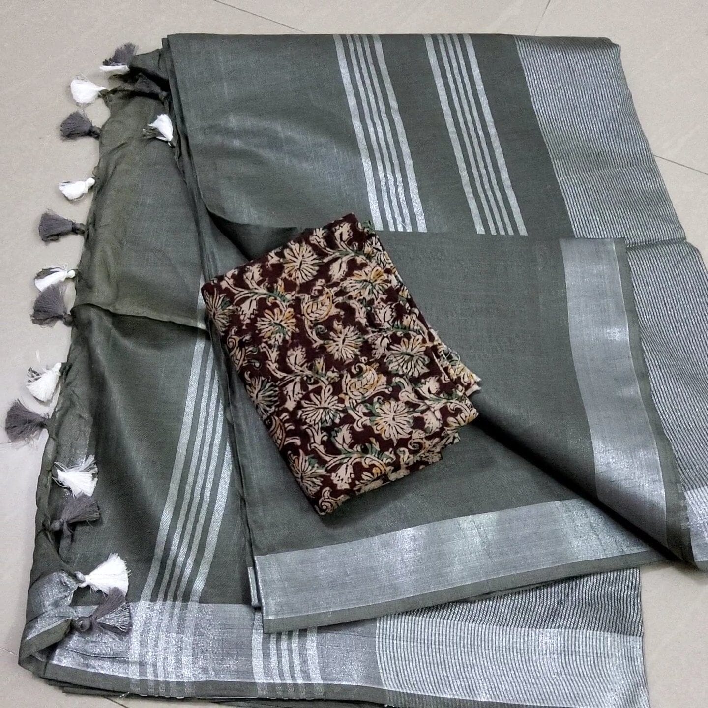 Linen Saree with Silver zari Border