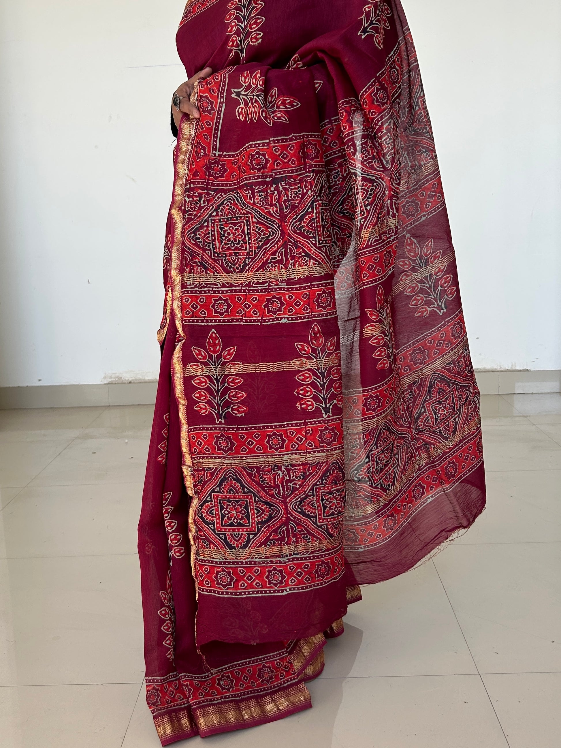 Maroon Hand Block Print Maheshwari Silk Cotton Saree