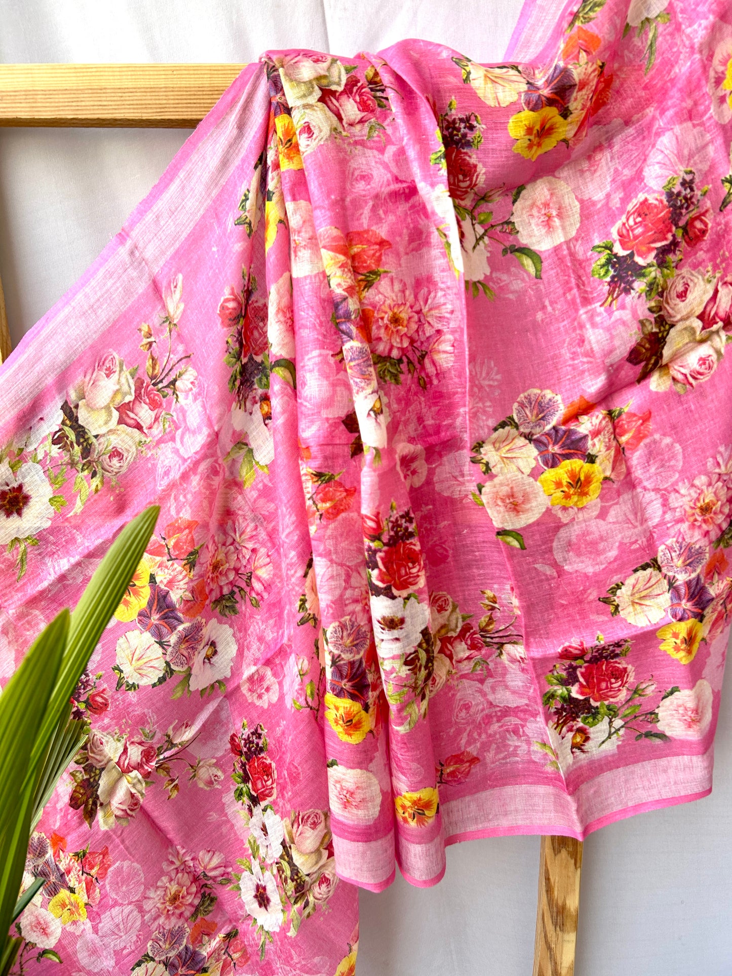 Pink Pure Linen Digital Print Dupatta with Silver Border and Tassles