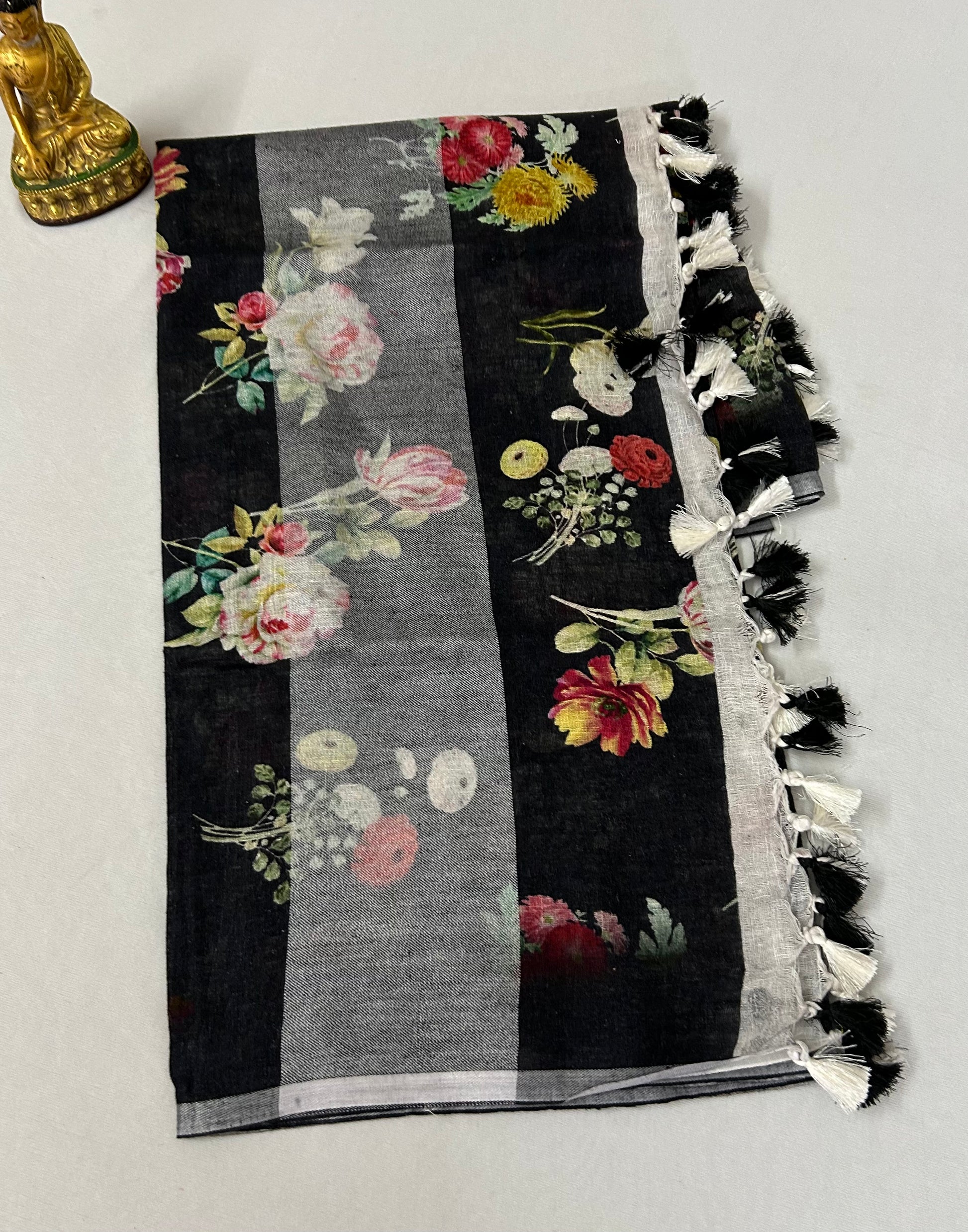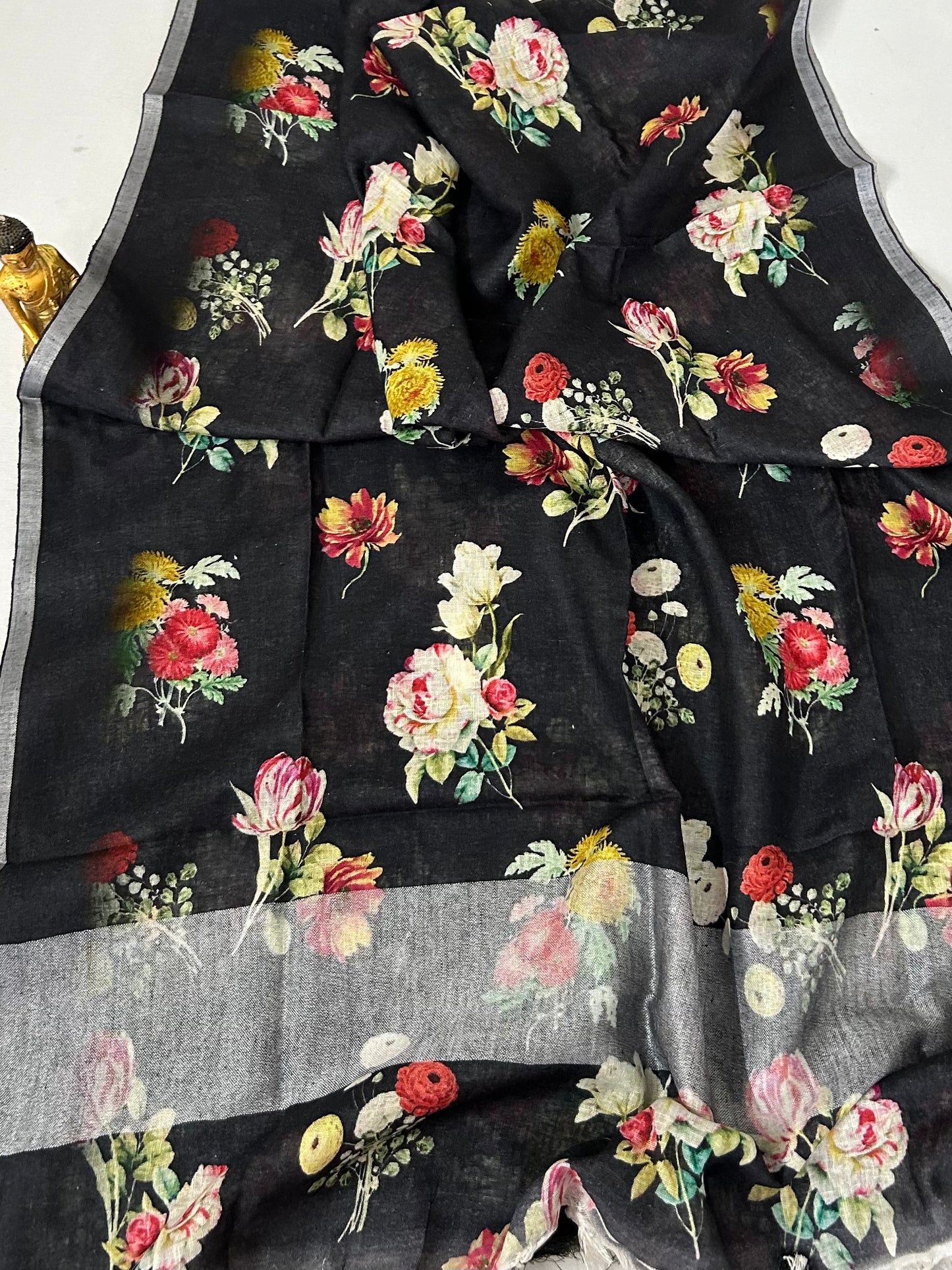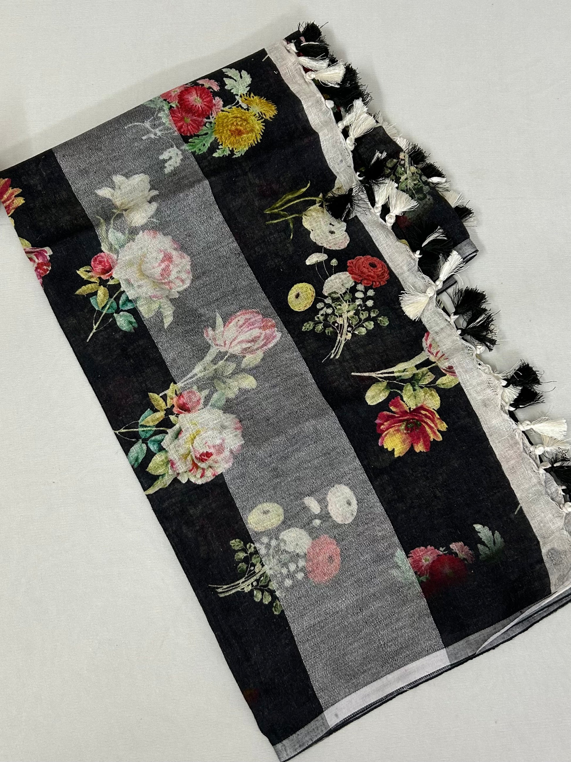 Black Pure Linen Digital Print Dupatta with Silver Border and Tassles