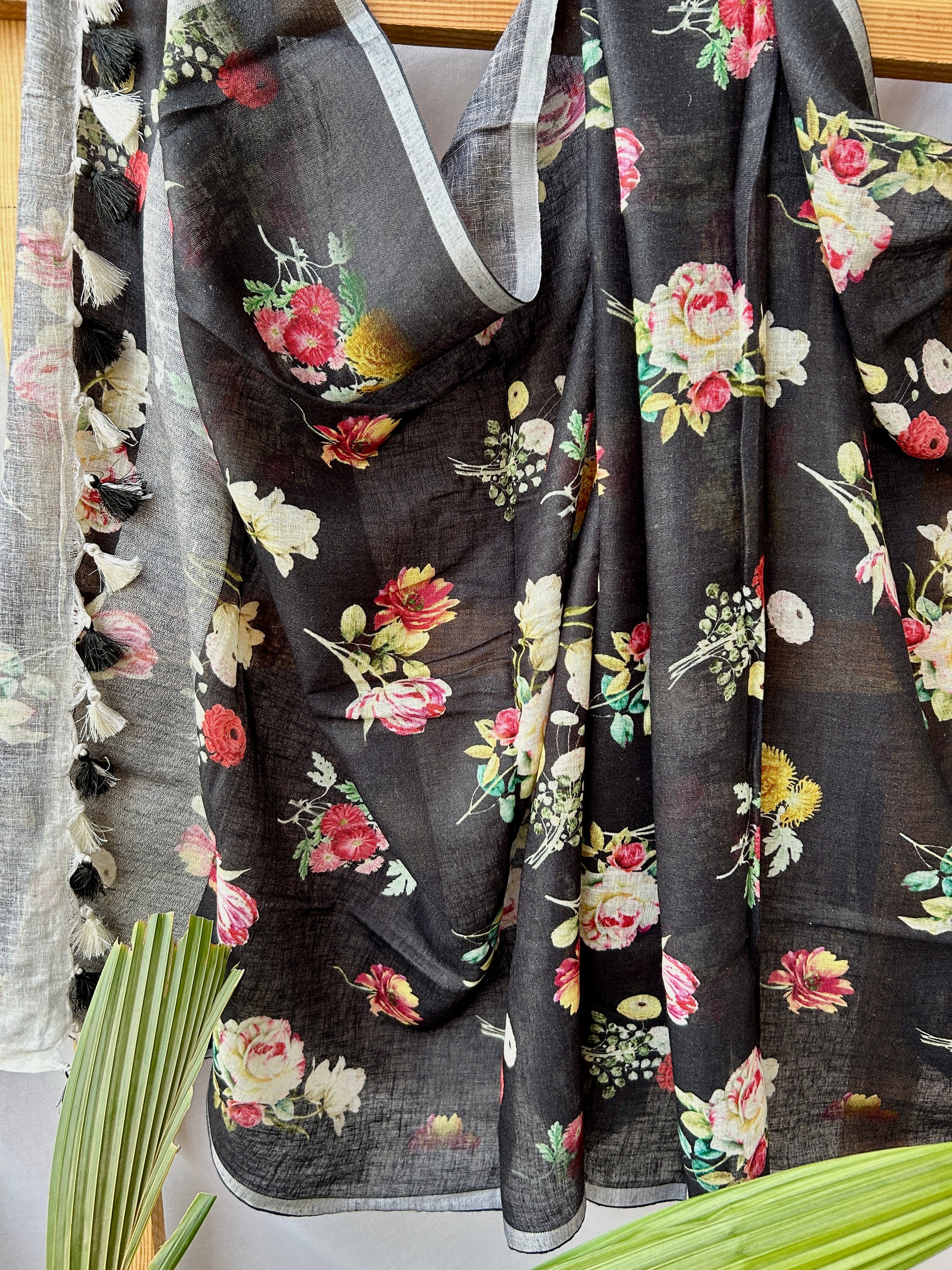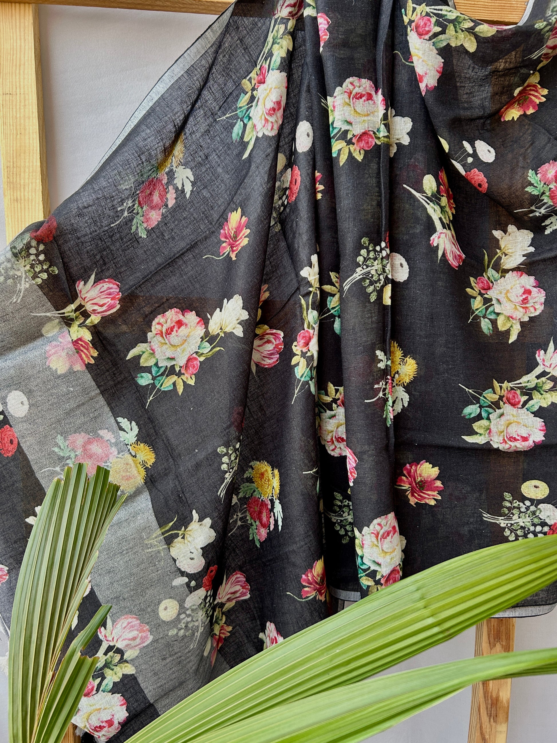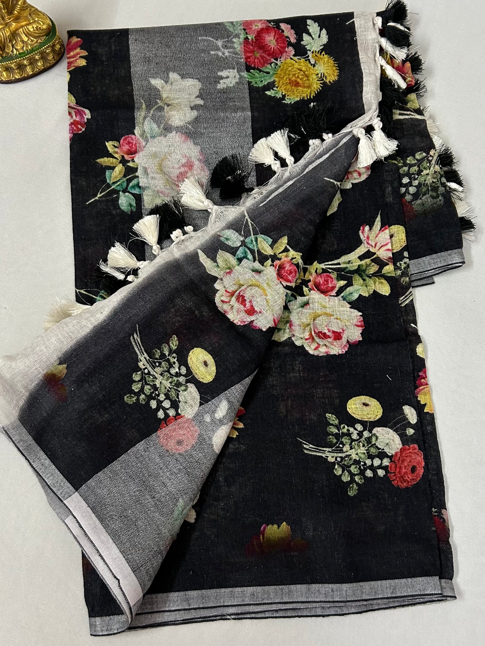 Black Pure Linen Digital Print Dupatta with Silver Border and Tassles