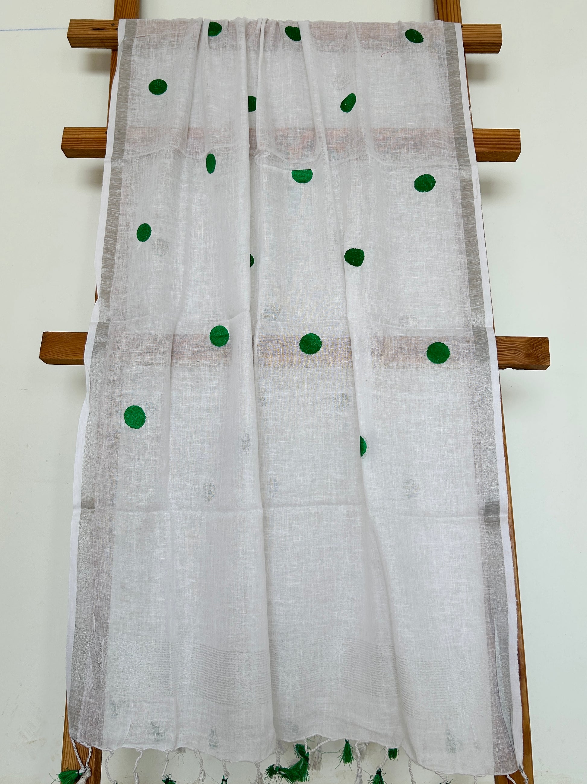 - This is a Pure Linen Dupatta with Silver border on both sides. It also has Pretty tassels on both sides